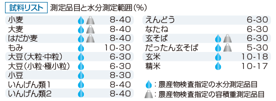 一部検査対象外品目の水分・容積重の測定も可能です。